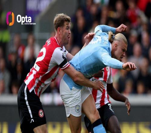 英超第7轮,曼城客场对阵布伦特福德,上半场哈兰德破门为曼城取得领先,至此,哈兰德在英超出战过的23座球场已有22...