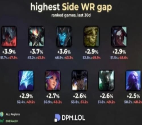 电竞体育10月4报道 外网数据统计媒体DPM.LOL分享了红蓝方胜率差距最大英雄榜...