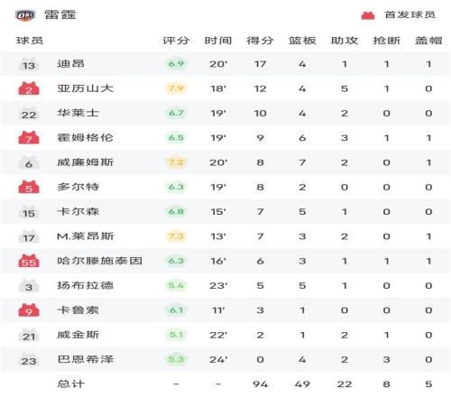 雷速体育10月18报道 25/26赛季NBA 季前赛,雷霆对阵掘金。双方全场战罢,雷霆94-91战胜掘金。迪昂砍下全场最高的17分4板1助,率领雷霆成功取胜。