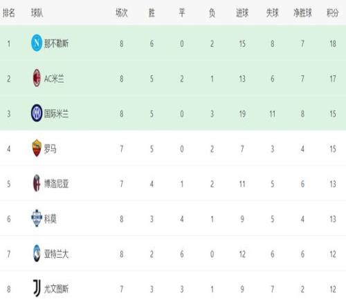 在积分榜上,随着那不勒斯击败国际米兰,导致榜首易主。那不勒斯6胜2负,拿到18分,登上了榜首位置。而AC米兰总积分是17分,掉到了第2名。国际米兰依然是15个积分,排名第3。第4的是罗马,也是拿到15分。博洛尼亚和科莫都是13分,排名第5和第6名。亚特兰大、尤文图斯和乌迪内斯都只拿到12个积分。