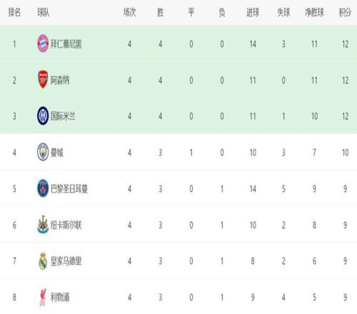联赛前四轮,两队保持全胜战绩,并且净胜球都是11个,拜仁依靠3个进球数优势,力压阿森纳排名第一。
